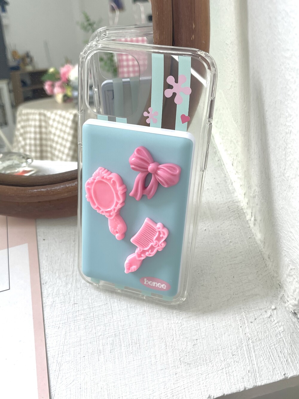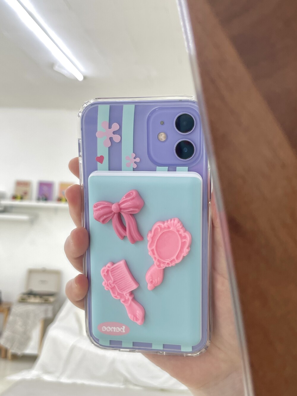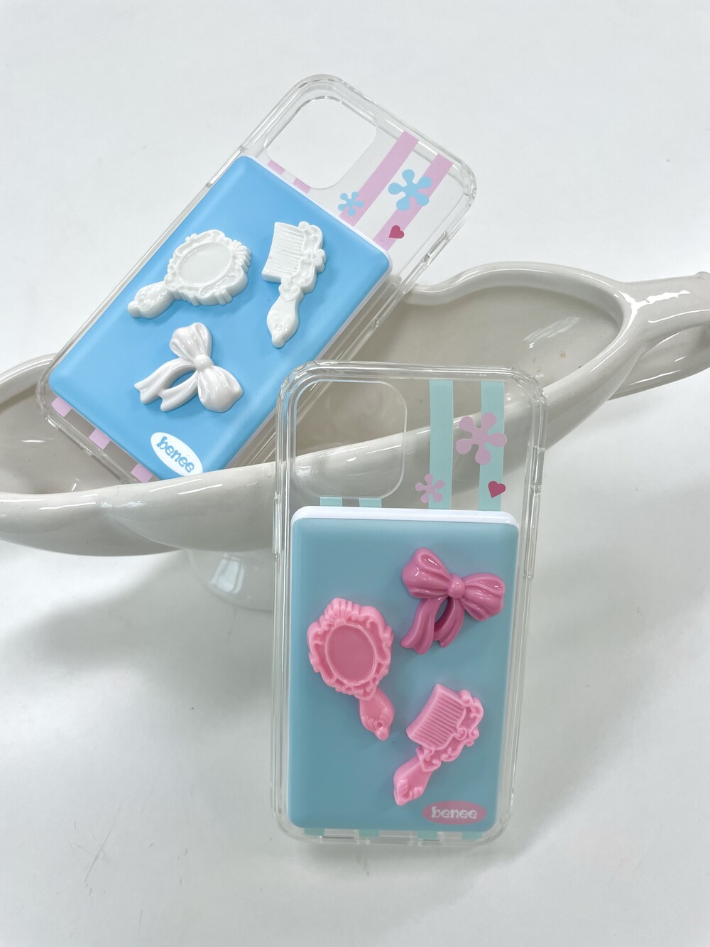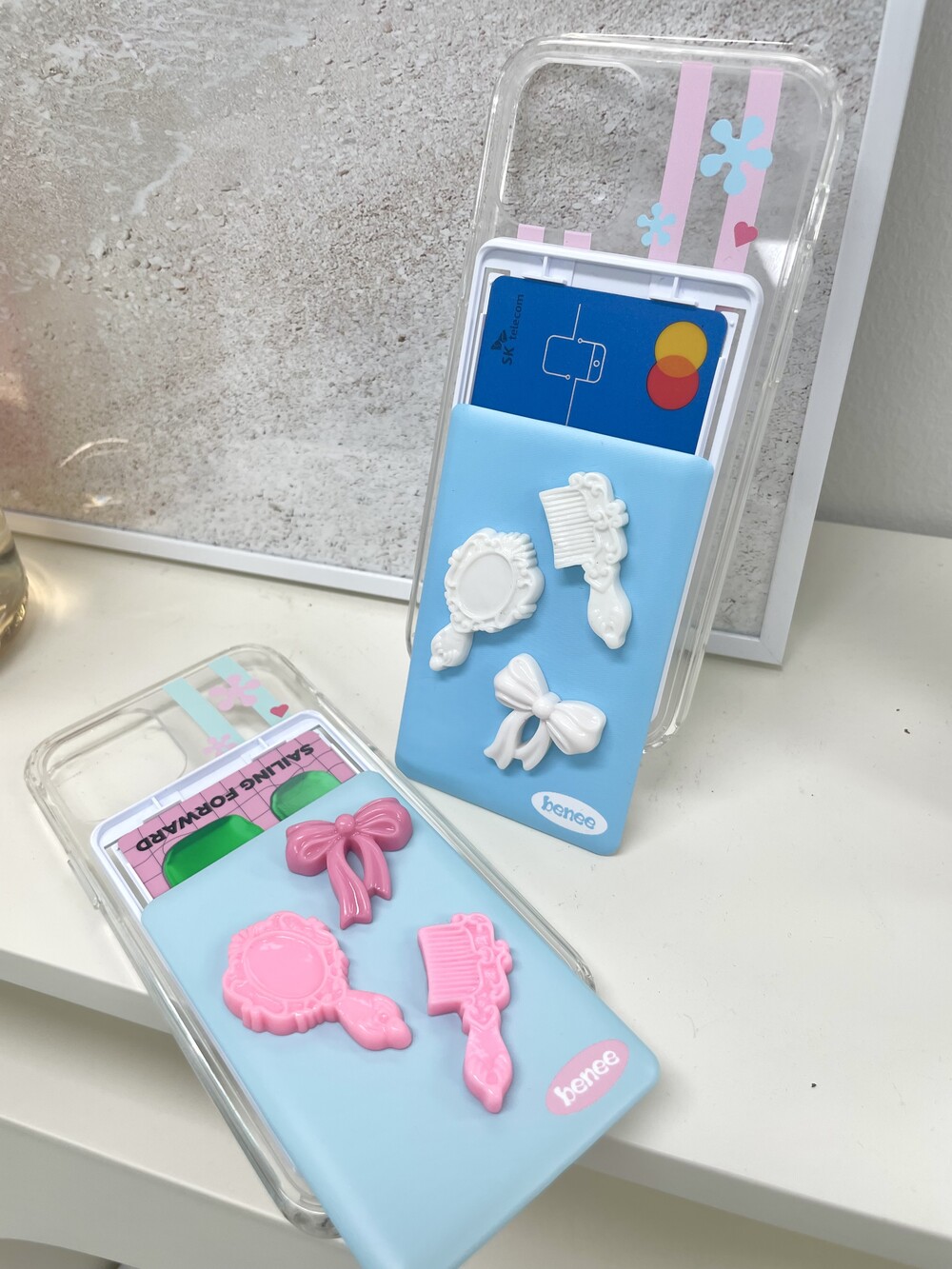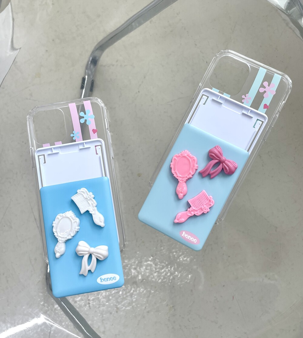 빗, 거울, 리본으로 제작된 슬라이드형 카드케이스가 부착된 폰케이스 입니다.