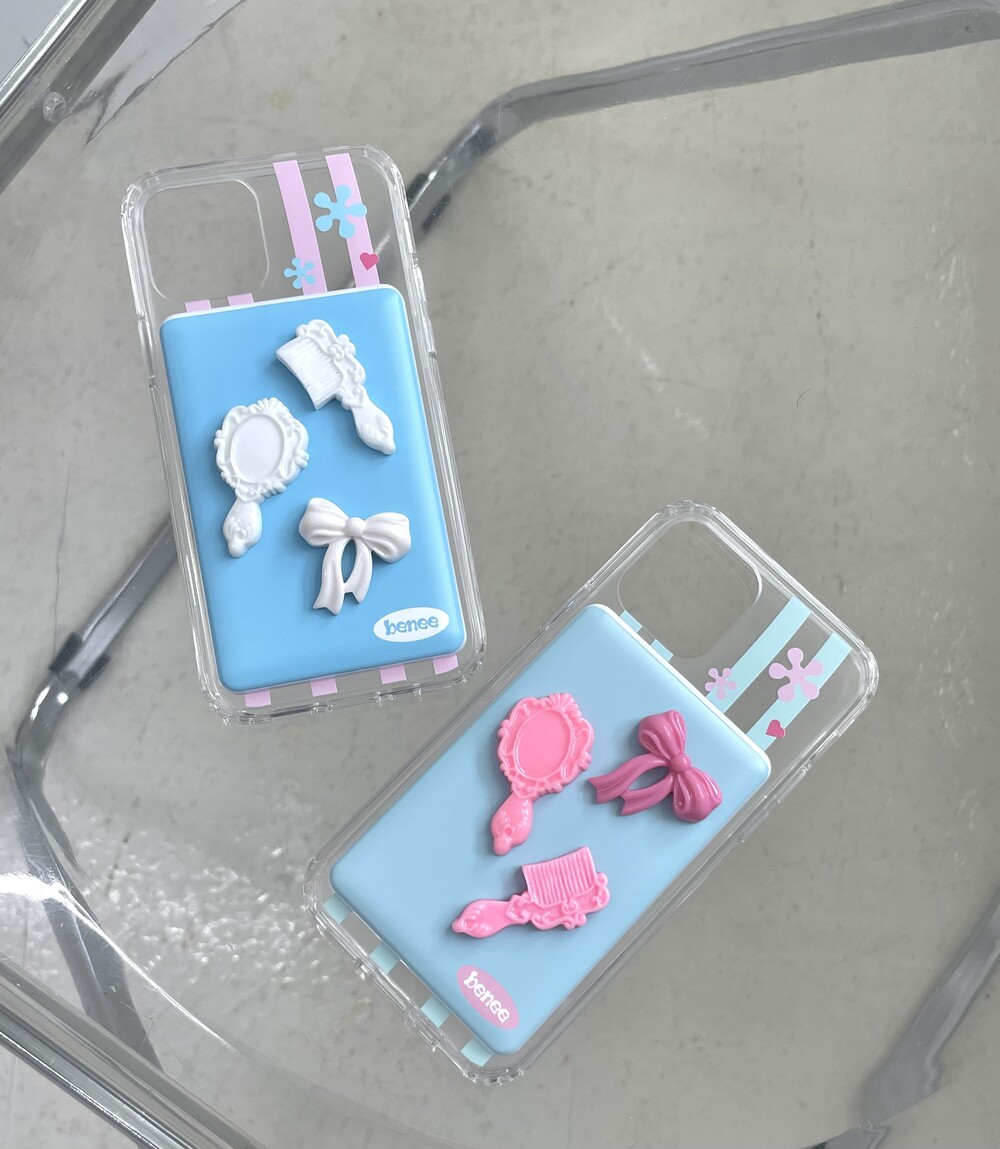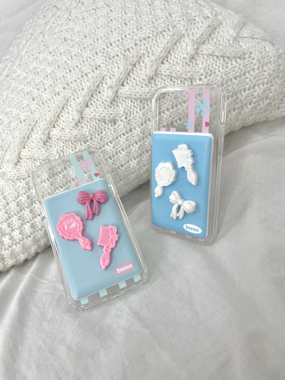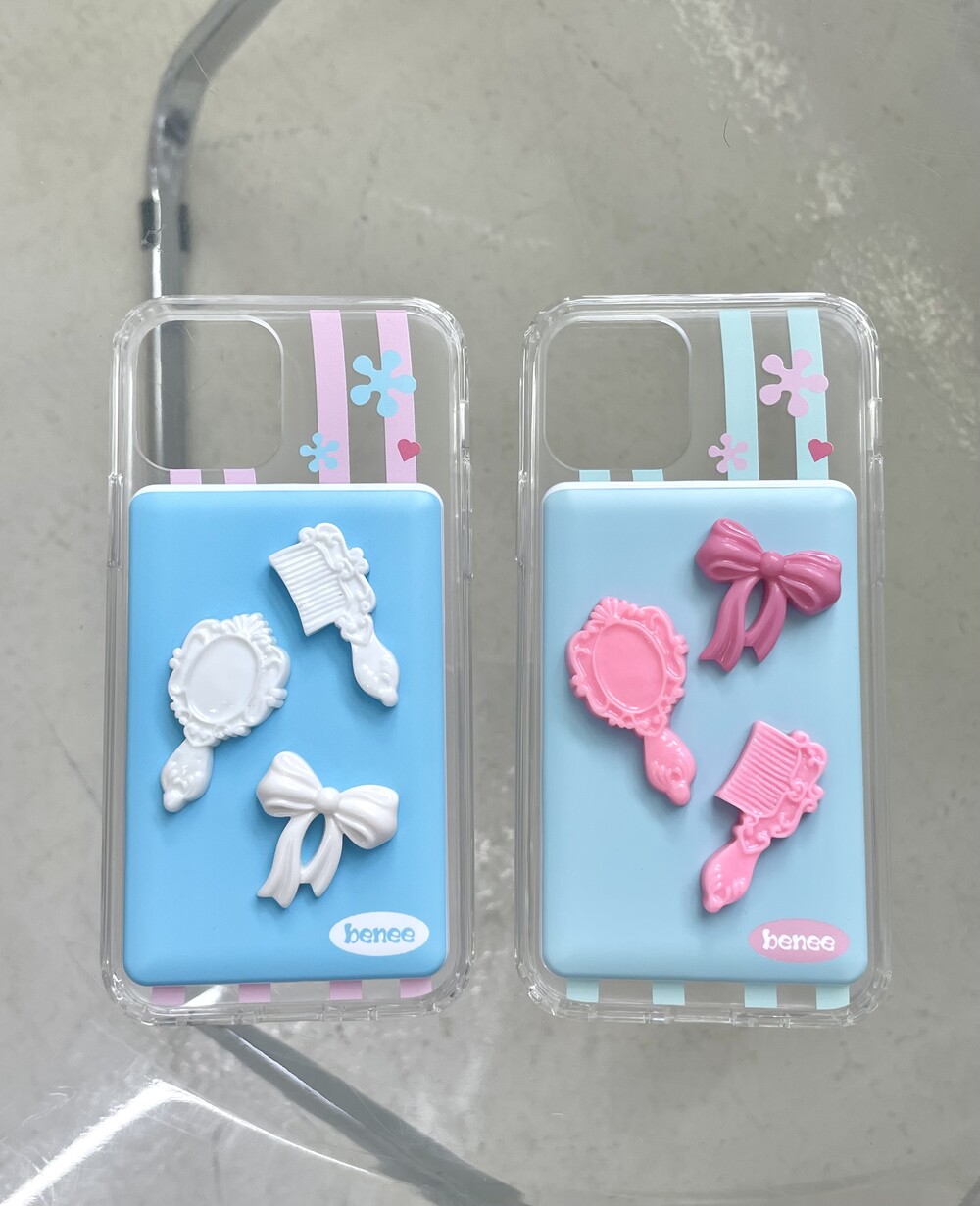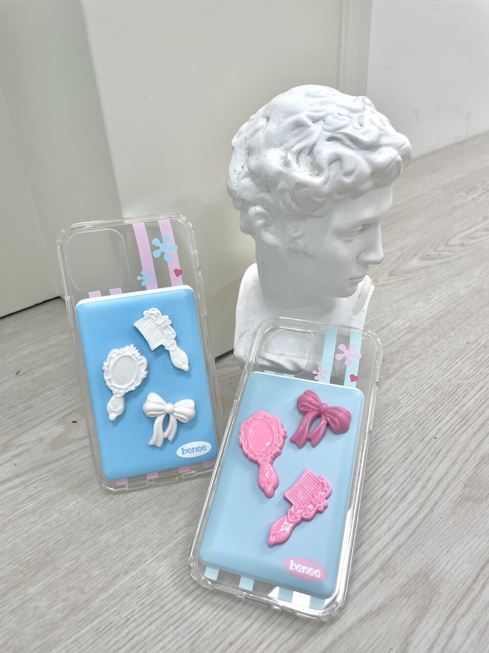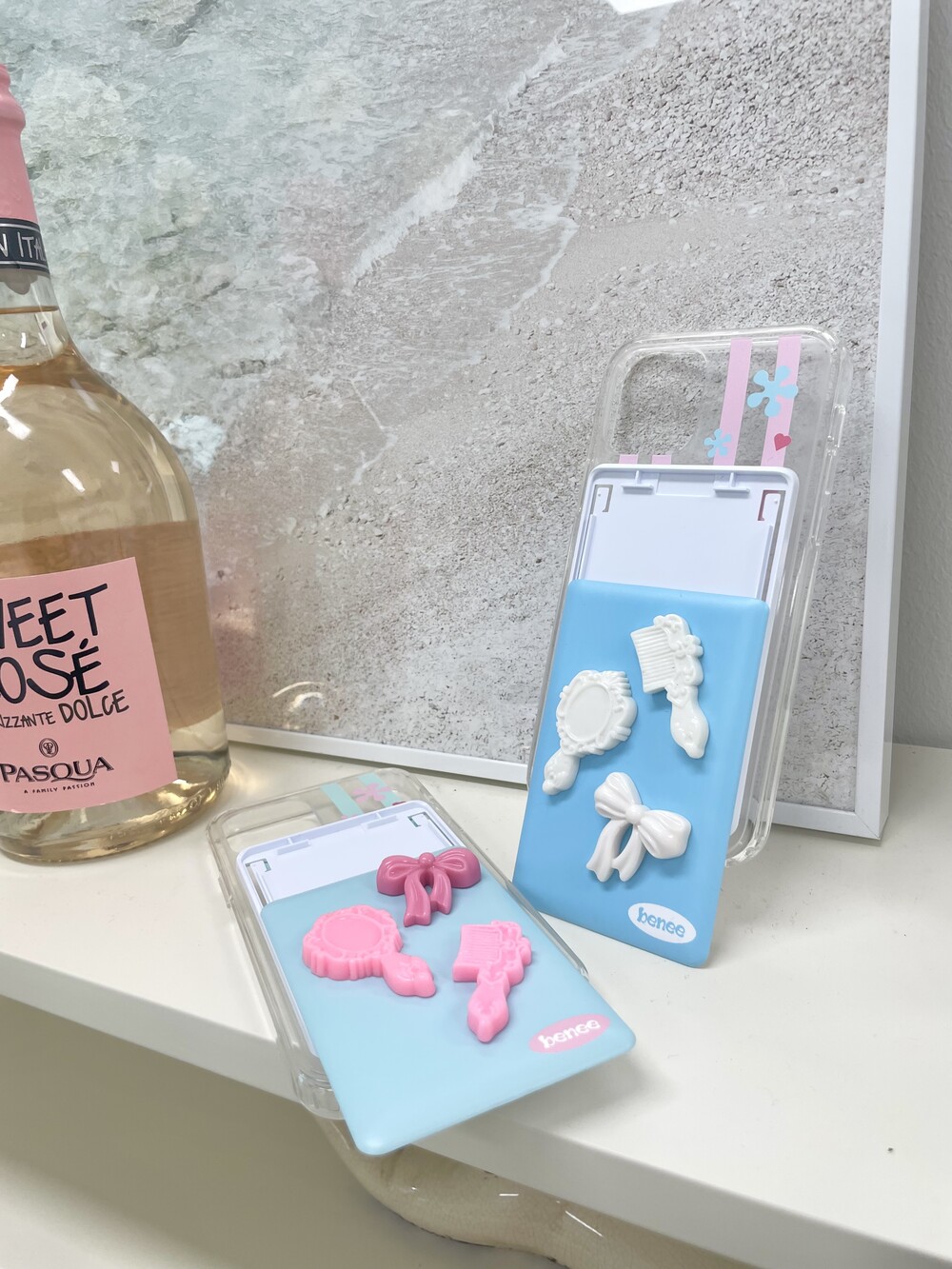 빗, 거울, 리본으로 제작된 슬라이드형 카드케이스가 부착된 폰케이스 입니다.