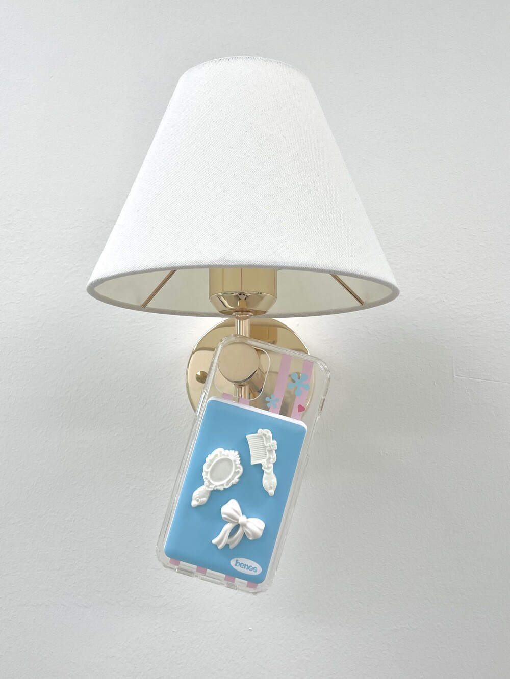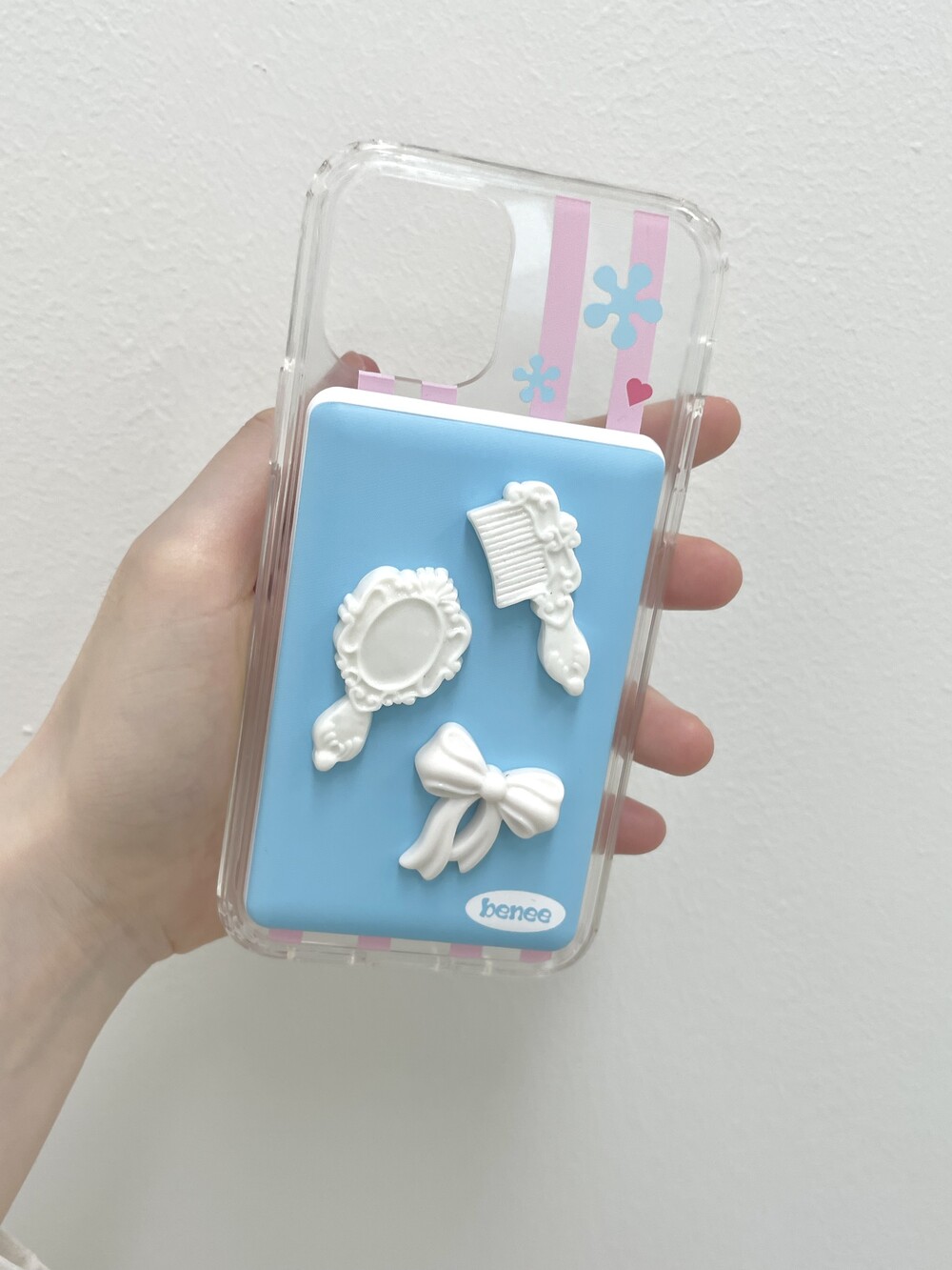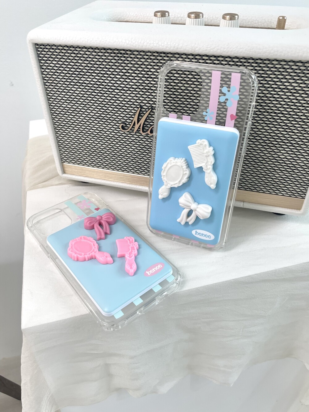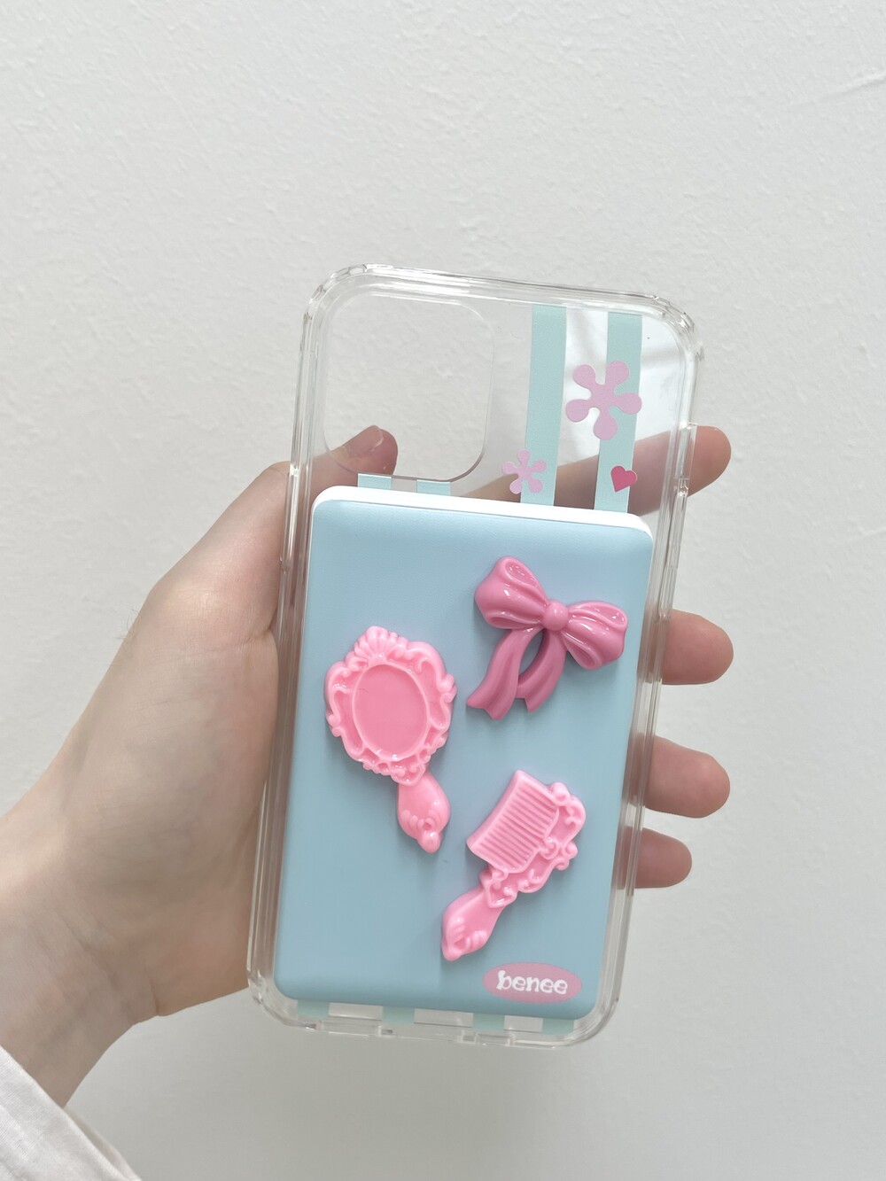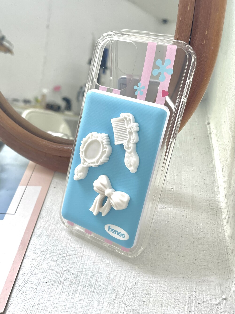 빗, 거울, 리본으로 제작된 슬라이드형 카드케이스가 부착된 폰케이스 입니다.